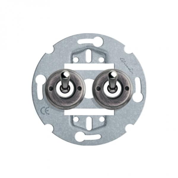 - Doppelter Kippschalter aus Messing, matt vernickelt und gebürstet. Um zwei Lampen aus einem einzigen Schaltereinsatz getrennt ein- und auszuschalten.