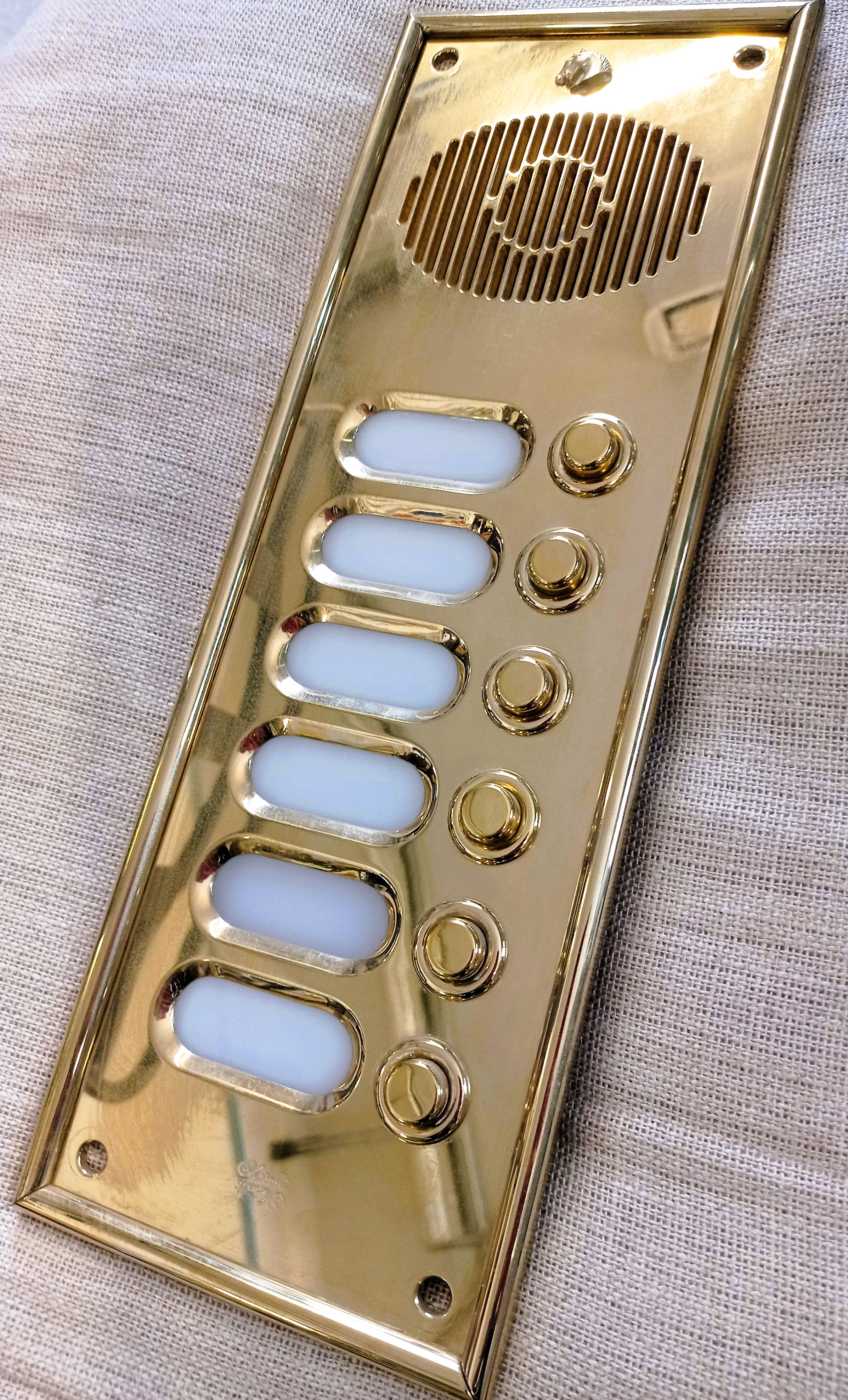 Jede Anlage wird in einer spezialisierten italienischen Manufaktur hergestellt und zeichnet sich durch langlebige Qualität und hochwertige Verarbeitung aus. Oberflächen stehen in Gold (messing poliert), silbern verchromt (Matt oder Hochglanz) oder Anthrazit grafitiert zur Auswahl. Form, Maße und Design – ob rund oder eckig, mit Umrandung oder ohne – werden individuell festgelegt. Auch bei der Anordnung der Klingeltaster und der Beschriftung (z. B. Gravuren, Logos) richten wir uns vollständig nach Ihren Vorgaben.