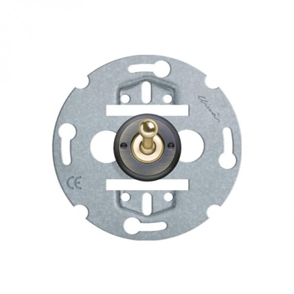 - runder Kippschalter aus Messing. Die Umrandung wird durch ein spezielles Erwärmugsverfahren "gebläut", um einen subtilen, fast schwarzen Effekt zu erzeugen.