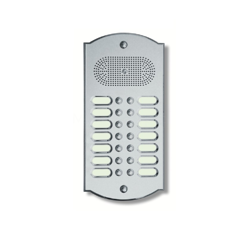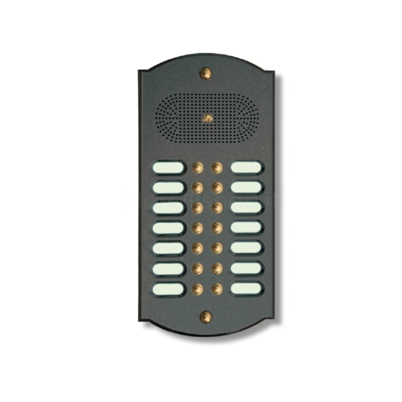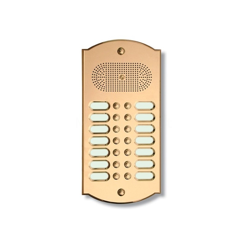 Italienische Klingelplatte mit 14 Klingeltastern für die Sprechanlage eines Mehrparteienhauses. Die Klingelanlage wird in Handarbeit aus feinem Uhrmachermessing gefertigt. Sonderanfertigung als Videosprechanlage möglich. Mit ihrer eleganten und den vielen Gestaltungsoptionen sind die Klingeltableaus ALESSIA besonders in Altbau-Immobilien gefragt.