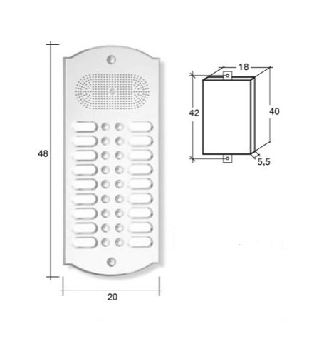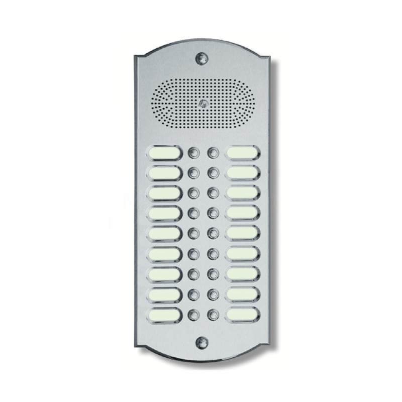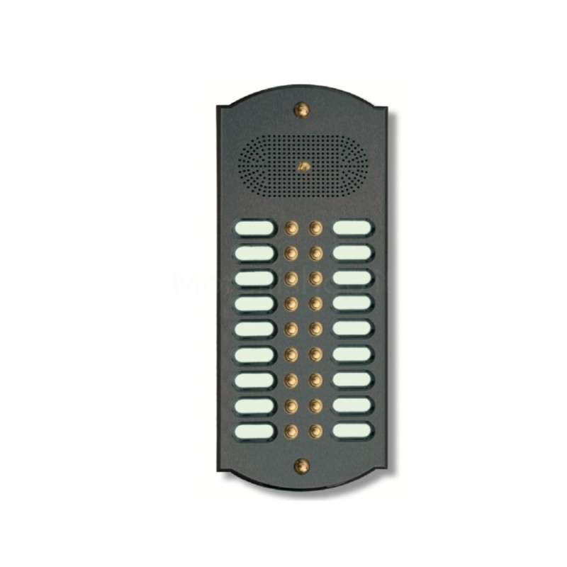 Klingelplatte mit 18 Klingeltastern für Sprechanlagen und Videosprechanlagen. Die Klingelanlagen stammen aus der nord-italienischen Region Emilia-Romagna und haben die dort typische, geschwungene Form. Die Klingeltableaus werden handwerklich aus Uhrmachermessing gefertigt. Mit den vielen Klingelkontaktoptionen finden die Klingelplatten ALESSIA gerne in einem großen eleganten Mehrfamilienhaus oder in Altbau-Immobilien Verwendung.