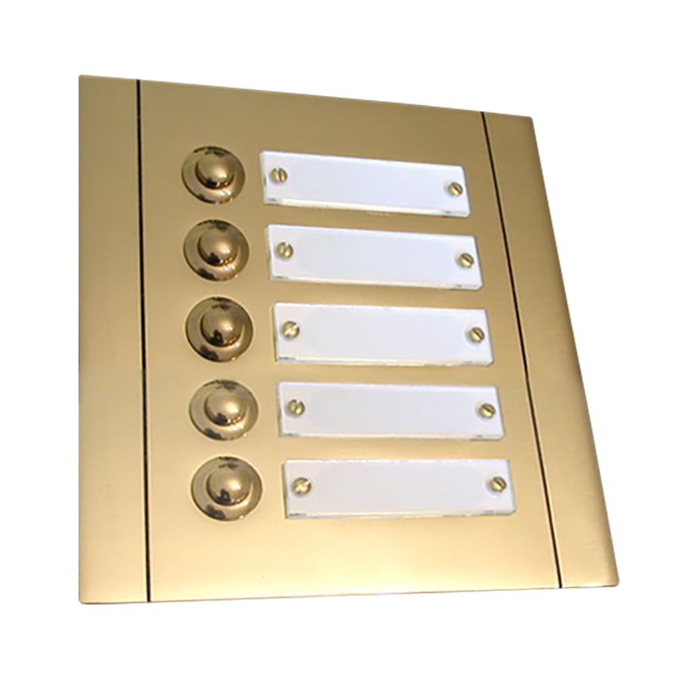 Klingelplatte mit 5 Klingelknöpfen, die sich für ein 4 bis 5 Parteienhaus eignet, je nachdem, ob man den 5. Taster als Lichtschalter verwendet. Durch die geringe Einbautiefe der Klingelkontakte lässt sich das Klingeltableau sowohl Unterputz als auch - mit geringen Veränderungen am Putz - Aufputz montieren. Die Klingelplatte wird aus echtem Messing in Handarbeit gefertigt. Die optionale LED-Beleuchtung der Platte ist nur in Verbindung mit Acrylnamensschildern sinnvoll, damit das Licht durchdringen kann.