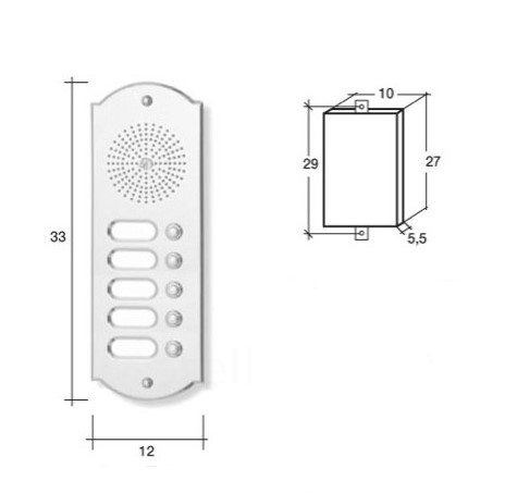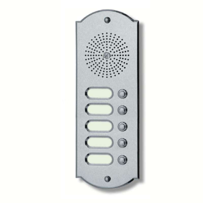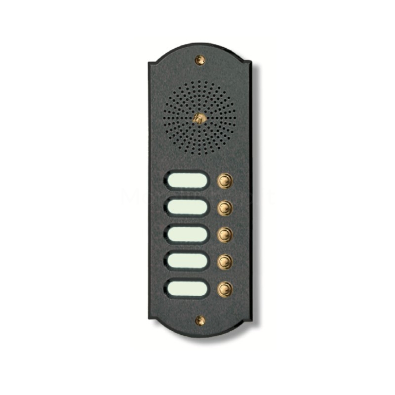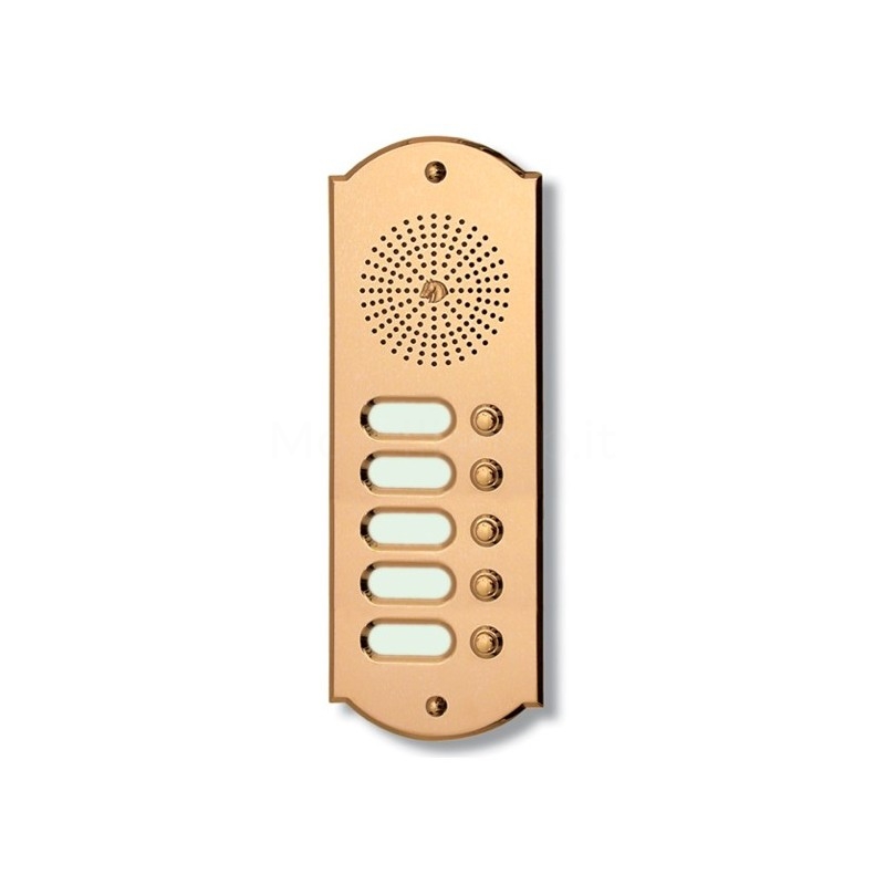 Italienische Klingelanlage mit 5 Klingelkontakte für die Tür-Sprechanlage eines Mehrparteienhauses. Die Klingelplatte wird aus hochwertigem Uhrmachermessing handwerklich gefertigt und anschließend beschichtet, um auch über die Jahre ihren Hochglanz zu behalten, ohne zu oxydieren. Sonderanfertigung als Videosprechanlage möglich.