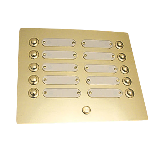 Hochwertige Klingelplatte mit 10 Klingeltastern aus echtem Messing für eine Altbau-Immobilie oder eine Mehrfamilienhaus. Uhrmacher - Messing, poliert, auf Wunsch lackiert oder matt gebürstet (Sondeanfertigung, +10%). Mit (optionaler) LED Beleuchtung. Sprechgitter für eine Sprechanlage und Kameraaussparung für eine Videotürklingel auf Anfrage.