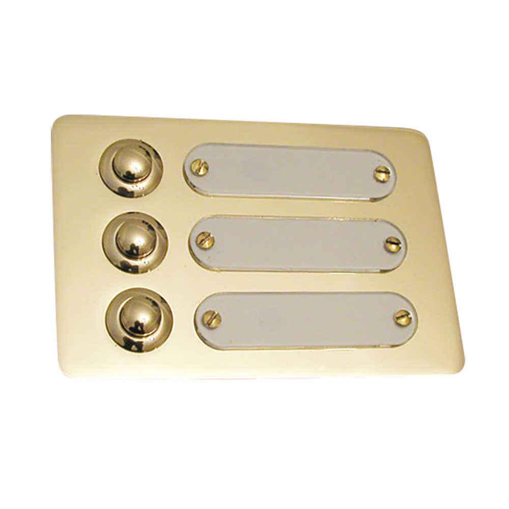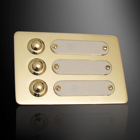 Klingelplatte für ein 2 bis 3 Familienhaus aus Messing, poliert, unlackiert. Durch die extra flachen Klingelkontakte für die Aufputz- wie Unterputzmontage geeignet. Namensschilder aus Plexiglas für die LED-Beleuchtung oder aus Messing für die individuelle Gravur. Der Gravurpreis gilt für eine Zeile/Namensschild mit max. 15 Buchstaben.