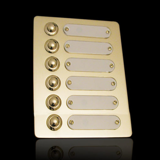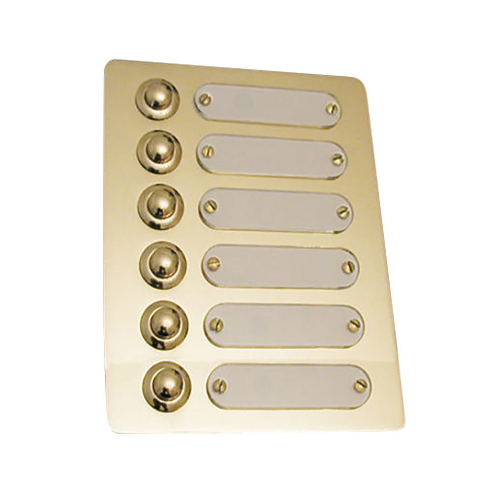Klingelplatte mit 6 Klingelknöpfen aus echtem Messing. Geringe Einbautiefe - für Aufputz und Unterputz. LED -Beleuchtung optional. Namensschilder aus Plexiglas mit beschriftbarer Folie oder aus Messing für die Gravur.