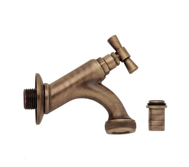 Der schlichte Wasserhahn hat einige schöne Details. Der Griff, ein sogenannter Schmetterlingsgriff ist - anders als bei üblichen Wasserhähnen für den Garten - geneigt, um so die Form des Wasserhahns perfekt zu ergänzen. Zum anderen verfügt der Wasserhahn über eine Rückplatte, eine Rosette, die den Wandanschluss elegant verdeckt. Der Wasserhahn ist aus massivem Messing gefertigt. Die antike Patina wird durch eine spezielle Feuerbrünierung erzeugt. Gefertigt wird der Wasserhahn für den Garten in einer kleinen italienischen Azienda, in Handarbeit.