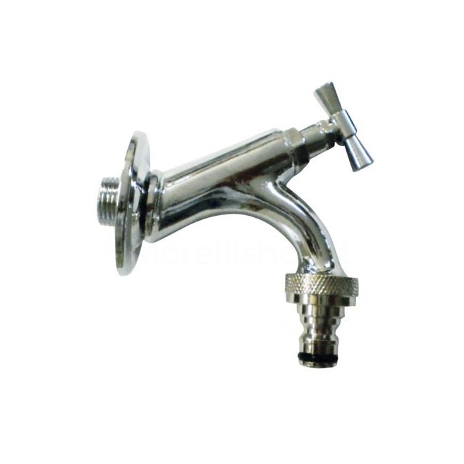 Wasserhahn mit Rückplatte und Schlauchanschluss. Der mitgelieferte Schlauchanschluss kann durch eine Schnellkupplung ersetzt werden.