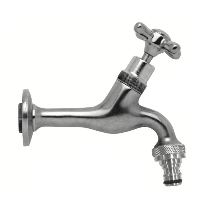 In dieser Variante wird der Wasserhahn mit einem Schlauchanschluss geliefert. Der Gartenschlauch kann einfach darüber gestülpt werden und mit einer Eisenschelle festgezogen werden, damit er nicht wegrutscht. Alternativ kann der Schlauchanschluss abgeschraubt werden und durch eine Schnellkupplung, die ebenfalls in dieser Kategorie zu finden ist, ersetzt werden. Der vernickelte rustikale Wasserhahn wird standardmäßig mit einer Schnellkupplung geliefert.