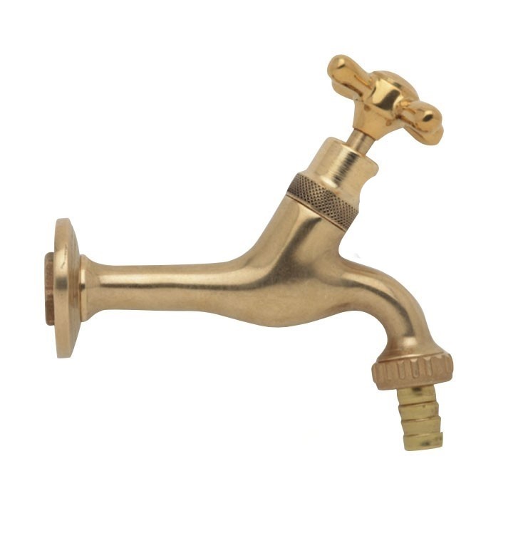 Rustikaler Gartenwasserhahn mit geneigtem nostalgischem Kreuzgriff. Der rustikale Gartenwasserhahn wird in einem Traditionsbetrieb aus massivem Messing gefertigt, poliert, nicht lackiert.
