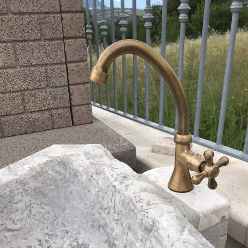 Diese Einhand-Waschbeckenarmatur im nostalgischen Stil verbindet hochwertige Handwerkskunst mit funktionalem Design. Gefertigt in einer italienischen Manufaktur, besteht der Wasserhahn aus massivem, feuer brüniertem Messing, das ihm eine edle, antike Patina verleiht. Das Material ist witterungsbeständig und rostfrei, wodurch der Hahn sowohl für den Innen- als auch für den Außenbereich bestens geeignet ist.